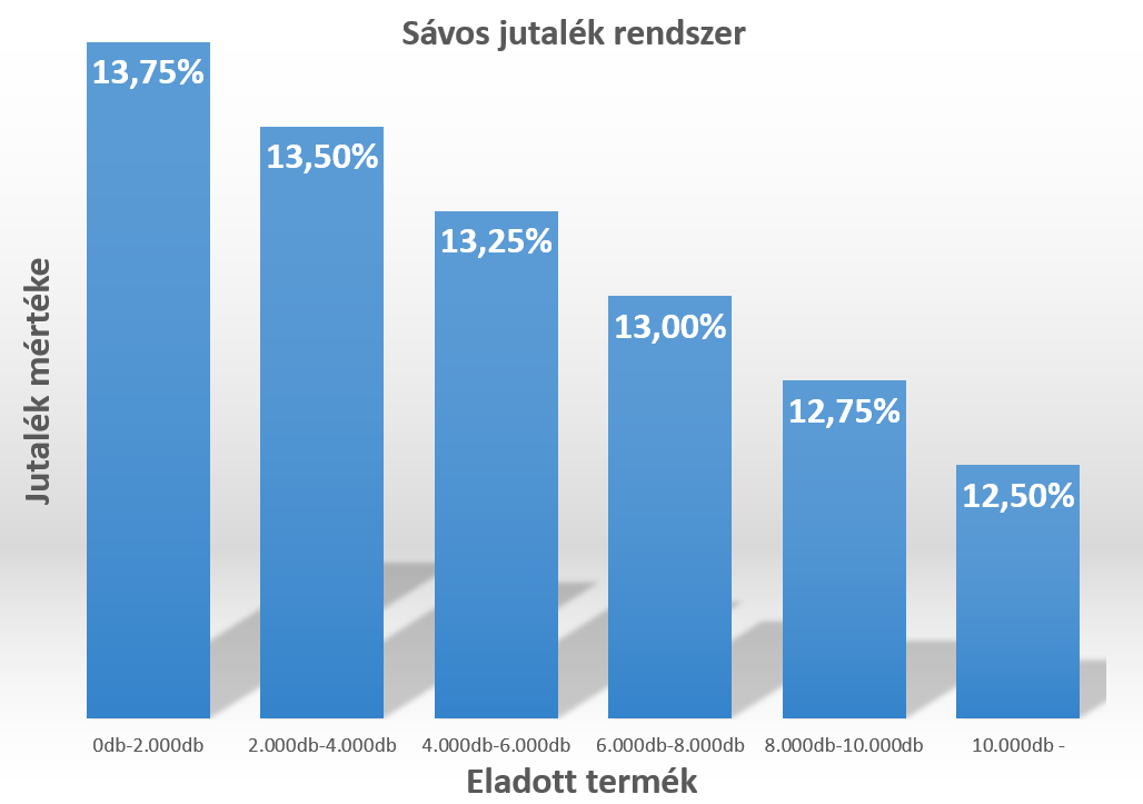(...és így tovább, egészen 12.5%-ig 10.000 db felett) Ez a mi módunk arra, hogy támogassuk a növekedését: a siker nálunk nem büntetést (magasabb díjat), hanem jutalmat von maga után.