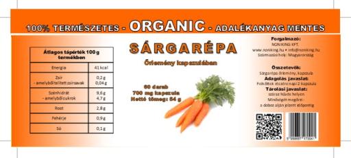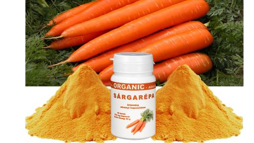 Összetevők: 100 % szárított sárgarépa porítva zselatin kapszulában (A sárgarépa ( 30-40 C-on) leszárított őrlemény, töltöttük zselatin kapszulába.)